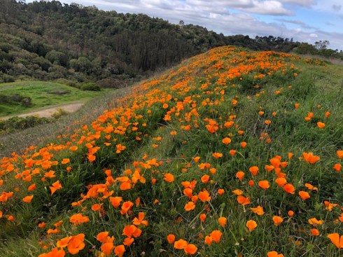 An alternate loop that features more of the volcanic features of the park, is instead of going left to stay on the Round Top Loop Trail (after the quarry pit), is to continue on the Quarry Trail, then take a right on the Volcanic Trail which will dead end into the top of Quarry Road, which you can take back down to the staging area.  Besides the volcanic features, this way is through open hillsides and features wildflowers, like CA poppies and lupine, in the spring (see picture below). The distance or time needed for the hike doesn’t change.  The map below shows the alternate loop.