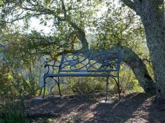 Keep going up, passing a marvelous bench, until you reach the eucalyptus grove. Starlings love to hang out here. Continue through and enjoy the views as you descend down the other side.