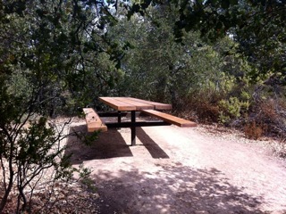 After just a short while you’ll reach a picnic table (picture below) and then a little further you’ll pass a random patch of redwood trees on the right.