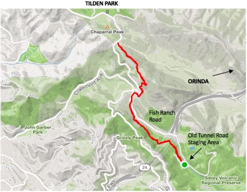 Directions: Take Highway 24 towards Oakland. Exit at Fish Ranch Road (last exit before tunnel). Take a left at Fish Ranch Road, cross over the highway, and then take a right on Old Tunnel Road. After about a third of a mile you’ll reach the Old Tunnel Road Staging Area for Sibley Park. This is where you park.